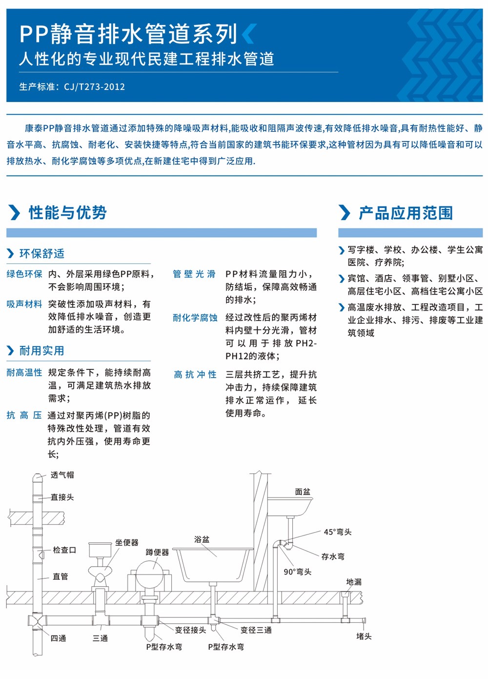 康泰牌聚丙烯靜音耐熱排水管道系統(tǒng)具有耐熱性能好、靜音水平高、抗腐蝕、耐老化、安裝快捷等特點,既可解決普通水管不能長期排放熱水的難題,又能有效的解決建筑內(nèi)管道噪音的困擾,符合當前國家的建筑節(jié)能環(huán)保要求。這種管材因為具有可以降低噪音和可以排放熱水、耐化學腐蝕等多項優(yōu)點,在新建住宅中得到廣泛應用。